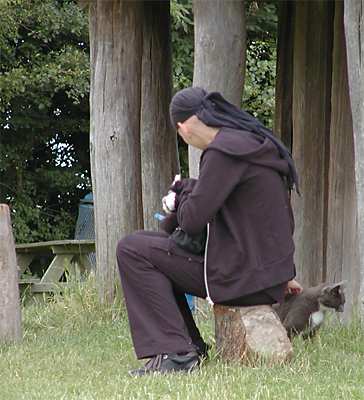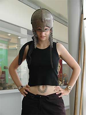 Vor der Wikingerhütte hat Annett wieder Kontakt mit einer Miez, was den Tag wenigstens ein bißchen rettet. Aus Rache für unsere Abweisung fängt es nämlich auch noch an zu nieseln. Wir stapfen also mißmutig über das Ausgrabungsgelände. Als Krönung des Ganzen hat das Museum eine Herde biologischer Rasenmäher (Schafe), die sich auf dem Gelände frei bewegen können. Als Folge dessen ist das ganze Areal übersäht von Schafkot. Auf Zehenspitzen bahnen wir uns eine Stunde lang unseren Weg durch die Ringburg. Völlig entnervt schauen wir dann noch flink in den ca. 100 m² großen, relativ leeren Museumsbau. Einziges Highlight sind Waffen, Helme und Kettenhemden, die man sich testhalber überstreifen kann. So ein Kettenhemd wiegt ca. 20-30 Kilo, Annett belässt es deshalb beim Aufsetzen eines Helmes.