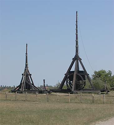 Die große und die mittlere Schleuder. Damit hat man mächtige Felsbrocken, aber auch Tierkadaver und den einen oder anderen feindlichen Spion verschossen. Man wußte bei letzteren immer genau, wann sie einschlugen: genau dann, wenn das Schreien aufhörte.