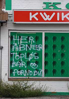 Lustige Beschriftung an einem geschlossenen SPAR-Markt. "Hier öffnet eine Topless-Bar und Pornoshow."